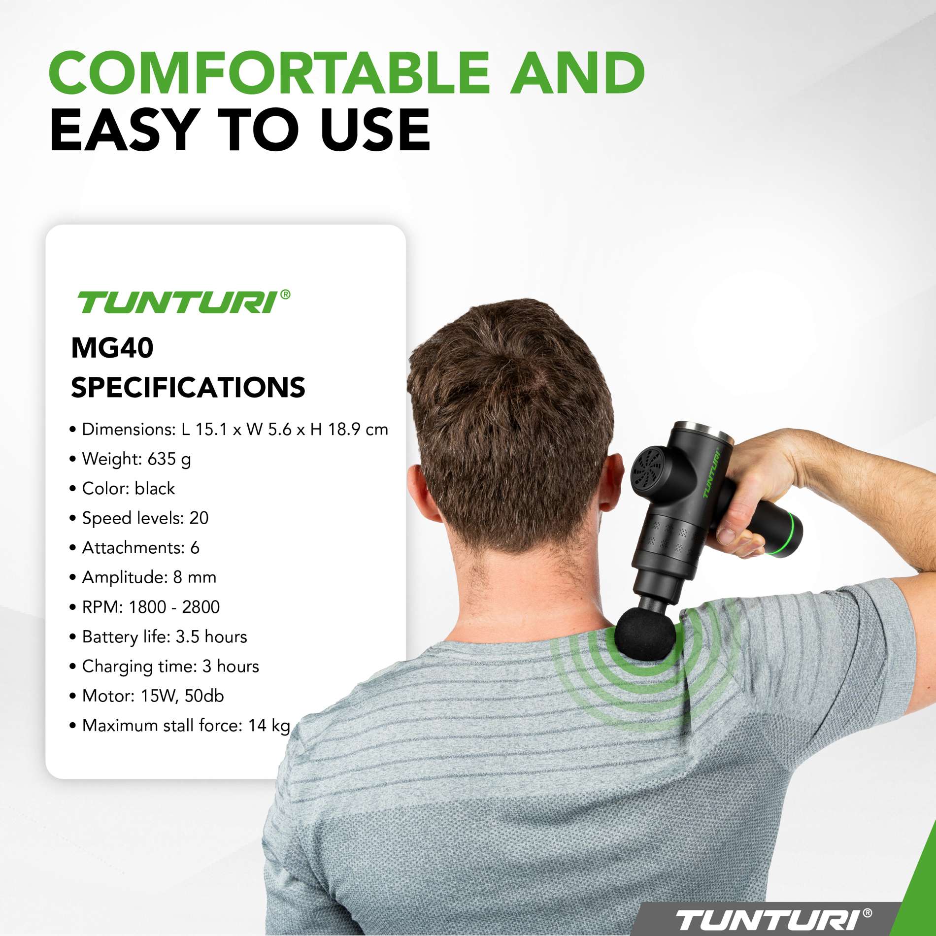 Massaažipüstol Tunturi MG40 on kompaktne ja võimas abivahend lihaste lõõgastamiseks ja taastumiseks. Sellel on 20 kiirusastet, 14 kg survet taluv jõudlus ning lihtsalt kasutatav LED-ekraan, mis teeb sobiva intensiivsuse leidmise kiireks ja mugavaks. Kaaludes vaid 635 g ja olles väike mõõtmetelt, sobib see ideaalselt nii koju, jõusaali kui ka kaasavõtmiseks. Laetav aku kestab kuni 3,5 tundi ning USB-C laadimine teeb selle eriti kasutajasõbralikuks. Komplekti kuuluvad 6 erinevat massaažipead, vastupidav kandekohver ja kasutusjuhend. MG40 sobib suurepäraselt sportlastele ja kõigile, kes soovivad leevendada lihaspingeid või taastuda treeningutest.